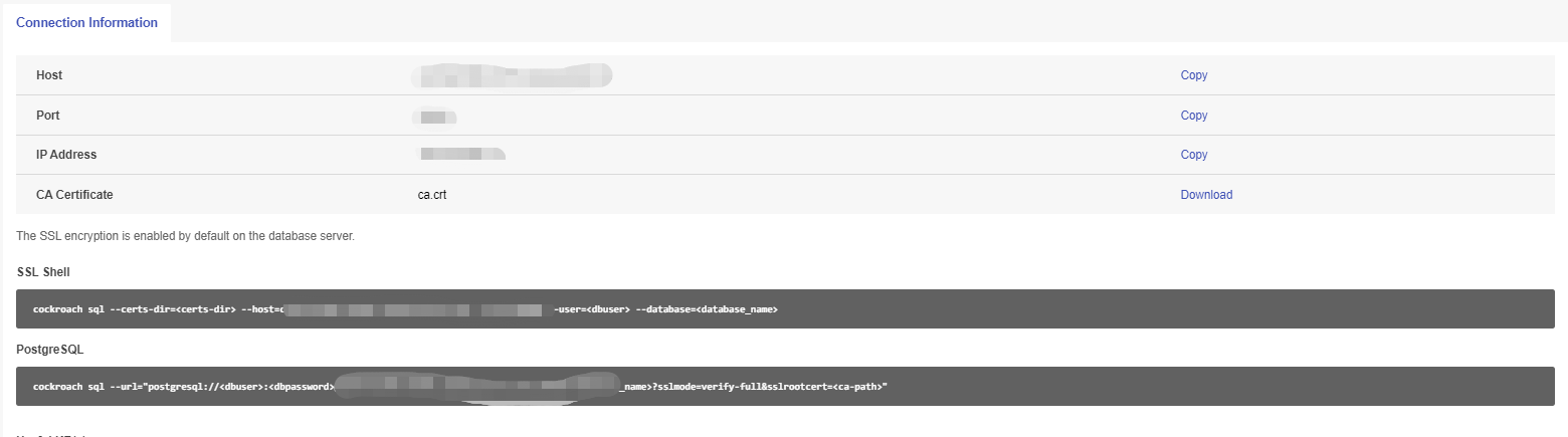 Click the "Overview" tab to get the connection information and then connect to your CockroachDB.