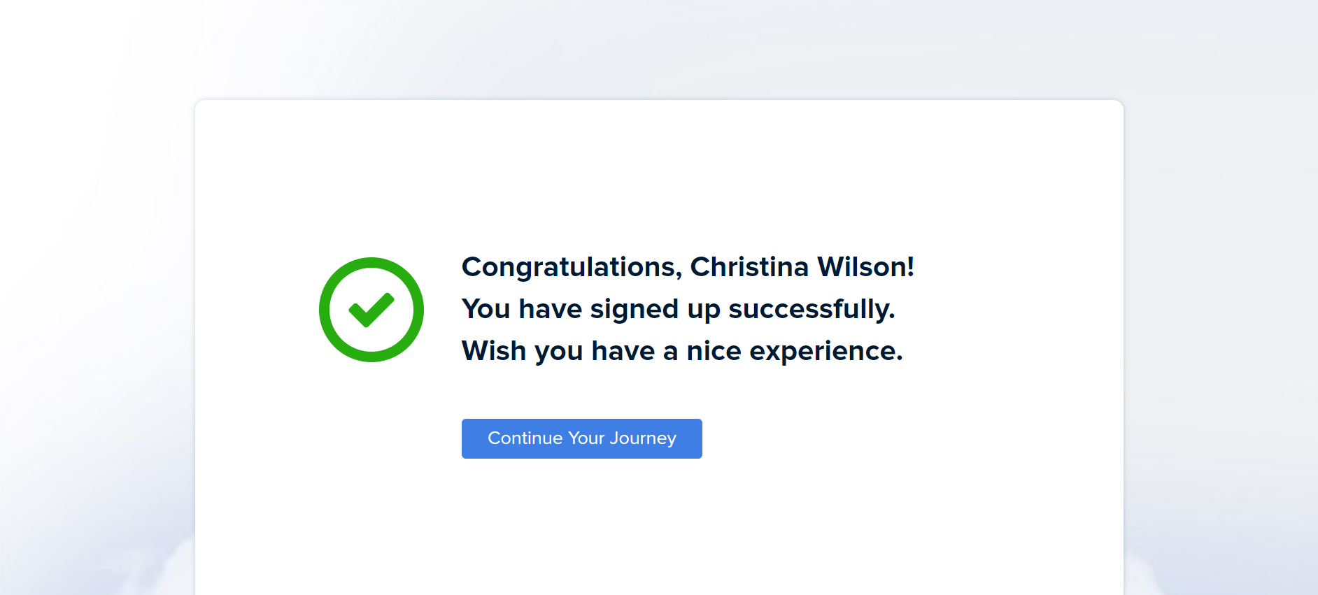 Congratulations, you have signed up successfully! Clicking the Continue Your Journey will take you to the homepage of the website with your account signed in.