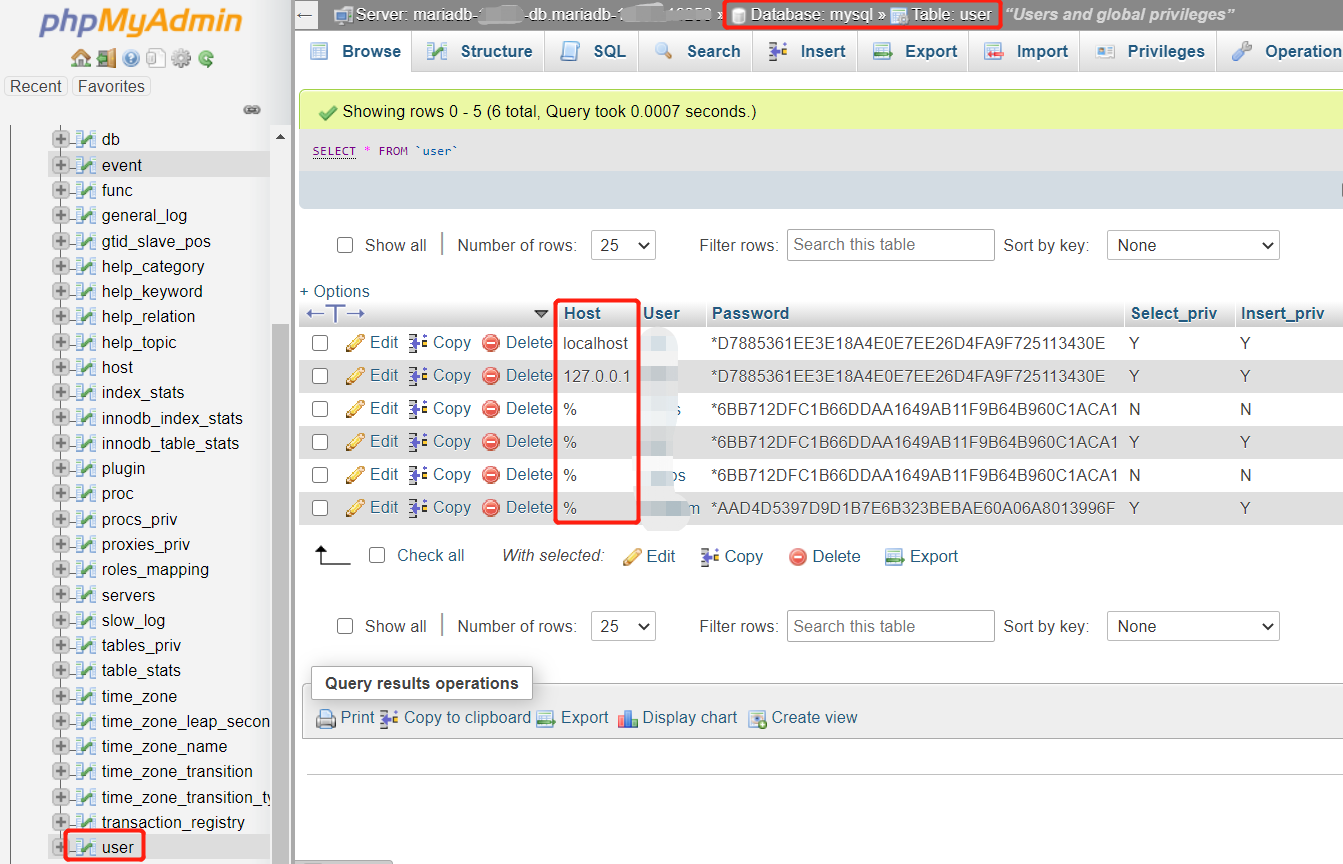 2) If a MariaDB user can log in to MariaDB via phpMyAdmin, please check if the user has remote connection permission in phpMyAdmin. The option ‘ % ’ means all hosts can connect to MariaDB user. While ‘127.0.0.1’ and ‘localhost’ mean the user does not support remote connection.