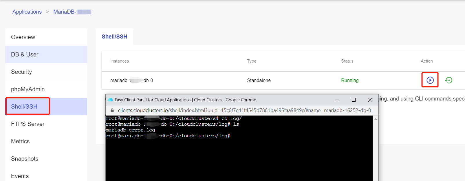 If the MariaDB service is not working, please use the shell tool in the Control Panel to check MariaDB logs. Inputting the command “cd log/”, then “ls -a”, followed by “vi mariadb_error.log” to open the log file.