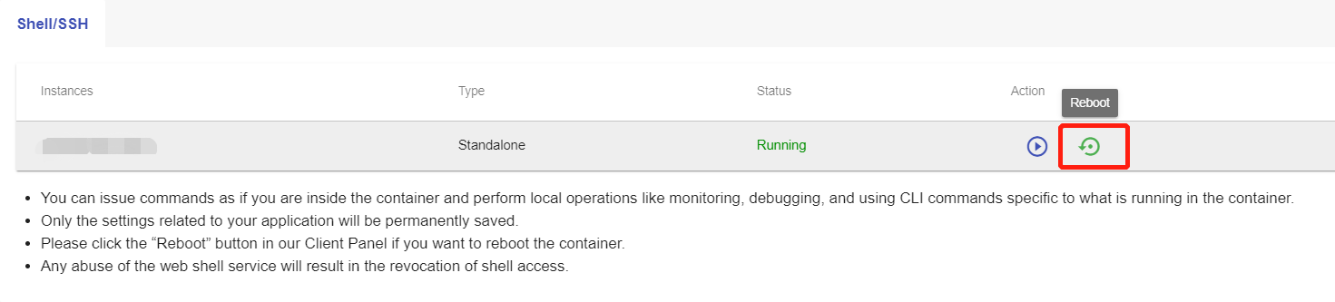 Click the "Manage" button on the Home page or the My Applications page to go to the Shell / SSH page.