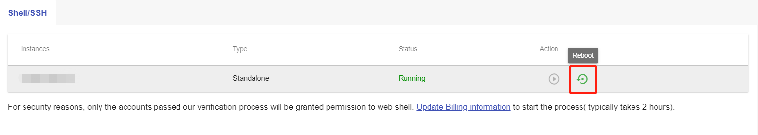 Click the “Reboot” icon to reboot the service on the Shell / SSH page.
