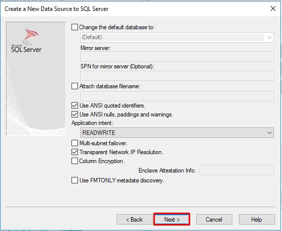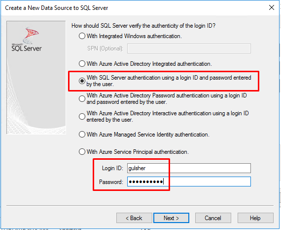 Tick on the third option (With SQL Server authentication using a login ID and password entered by the user) and enter the database user name and its password. Then, click the Next button.