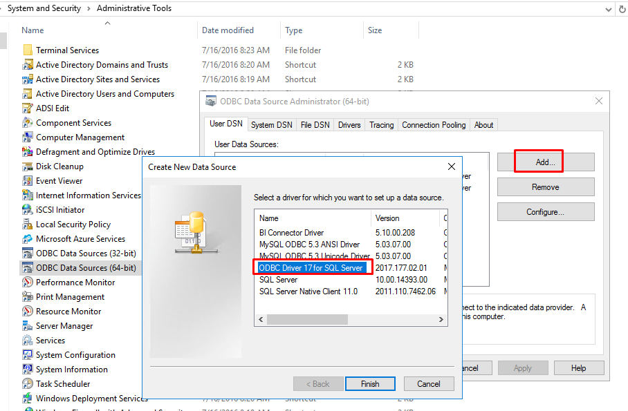 Click “Add” to create a new data source; then, choose “ODBC Driver 17 for SQL Server.”