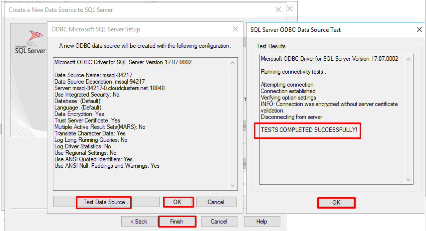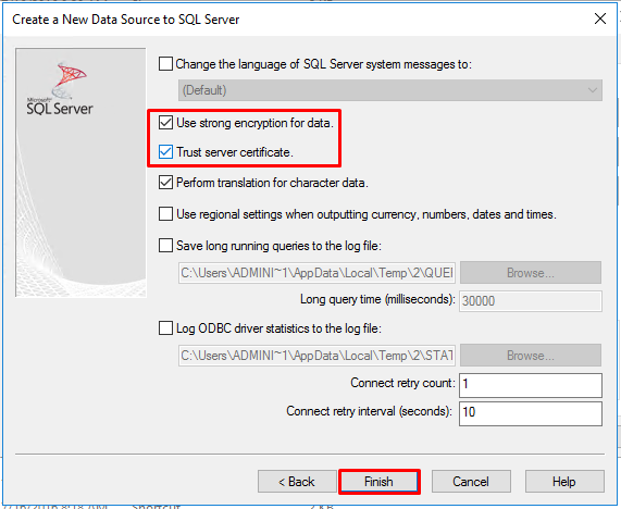 Check options "Use strong encryption for data" and "Trust server certificate" on. After that, click Finish.